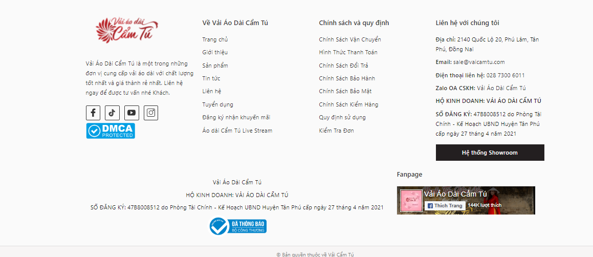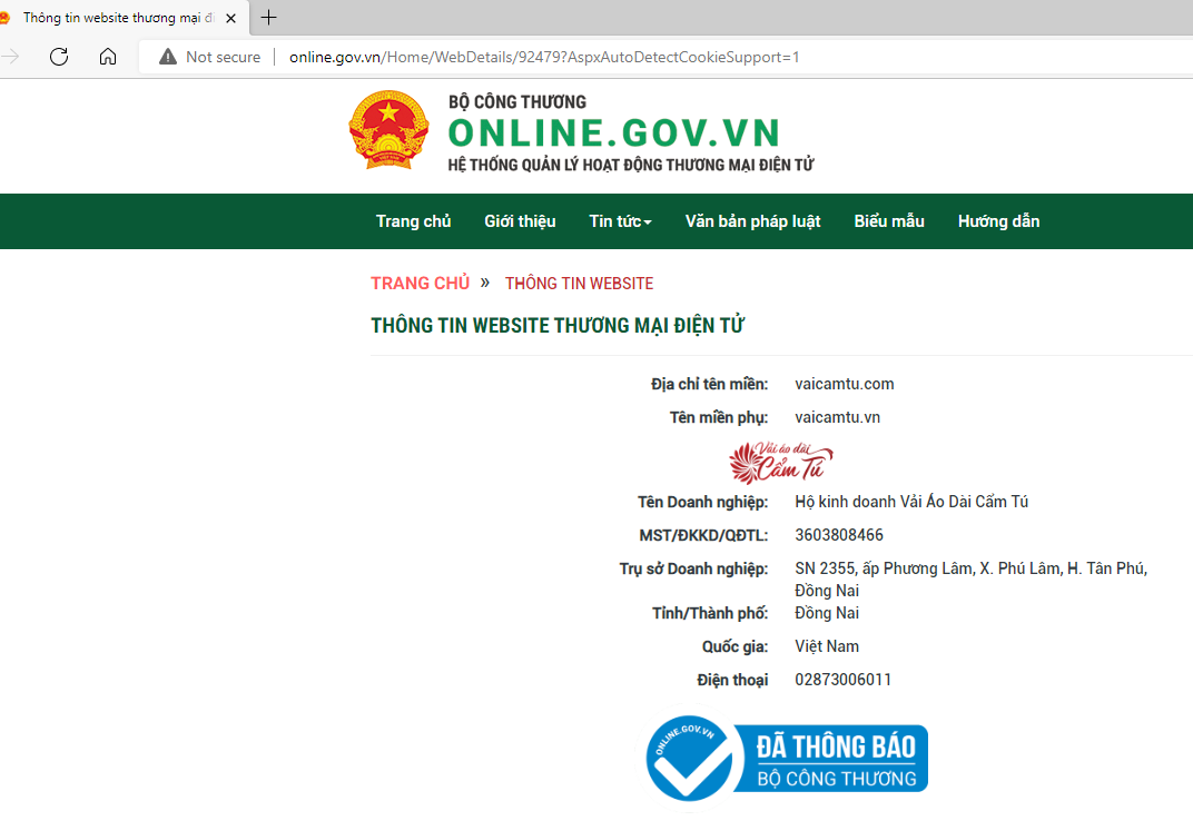 Với phương châm kinh doanh chân chính và mục tiêu NÂNG CAO UY TÍN CỦA WEBSITE vaicamtu.com nhận biết sớm được điều này Vải Áo Dài Cẩm Tú đã sớm đăng ký tên miền và sớm đăng ký với bộ công thương về các hoạt động kinh doanh, thông tin trên không gian mạng.